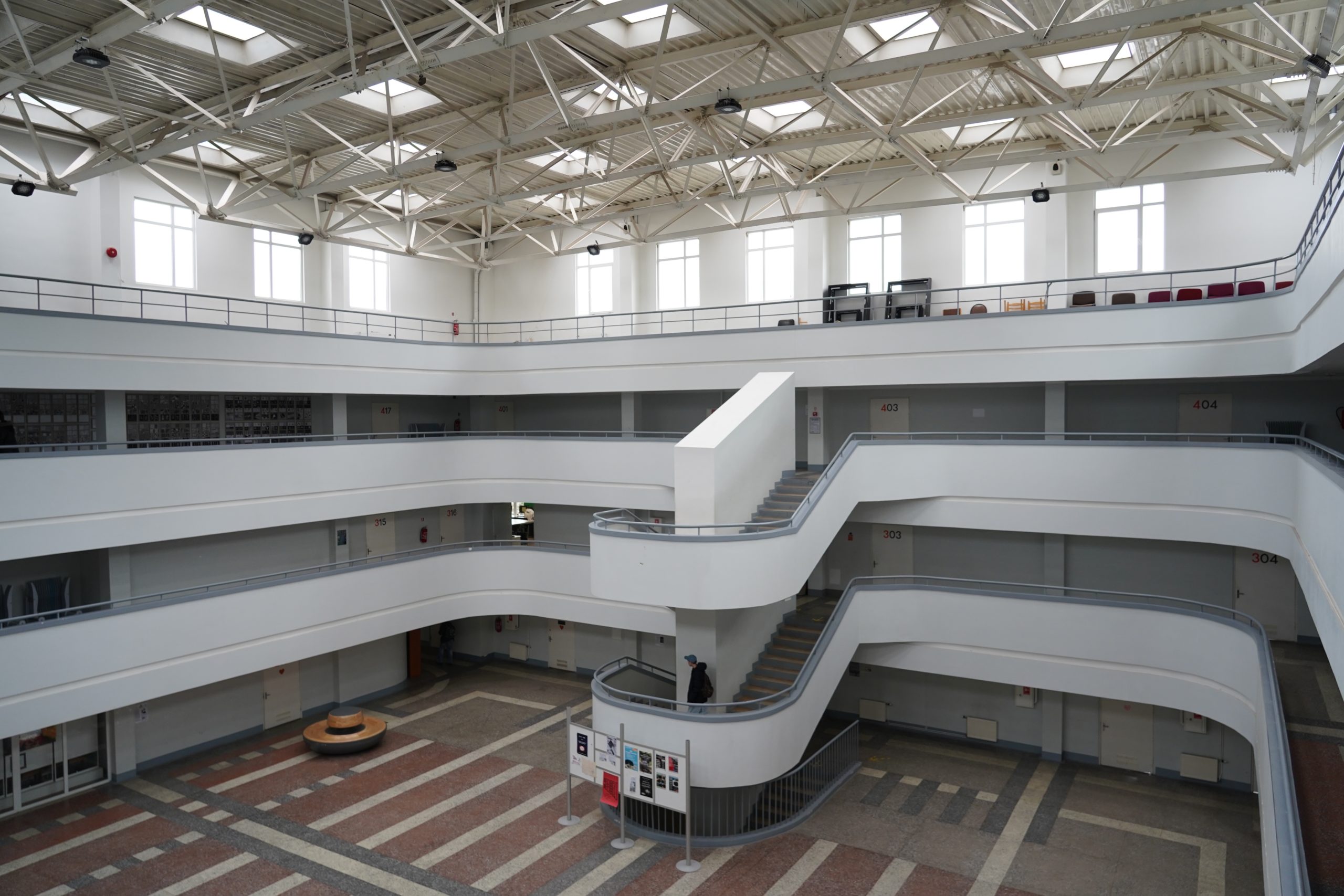Pirmie kursi pulcējas halles pirmajā stāvā, pārējie kursi – augšējos stāvos.